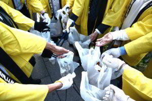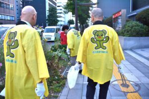 日が傾き始める時間帯にもひときわ目を引く黄色の法被を羽織り、歩道や植え込みの清掃を通じて地域の美化に貢献しました。